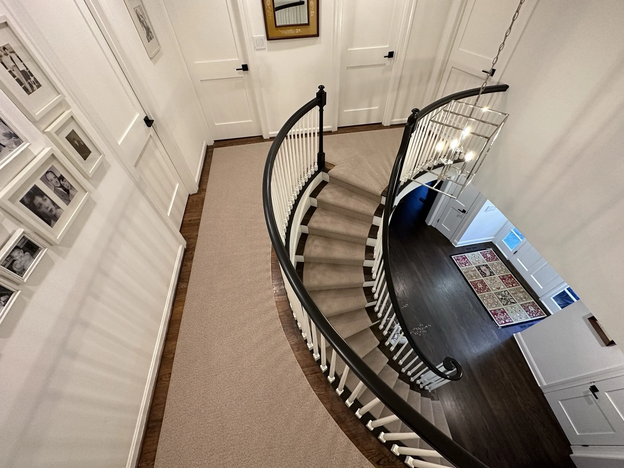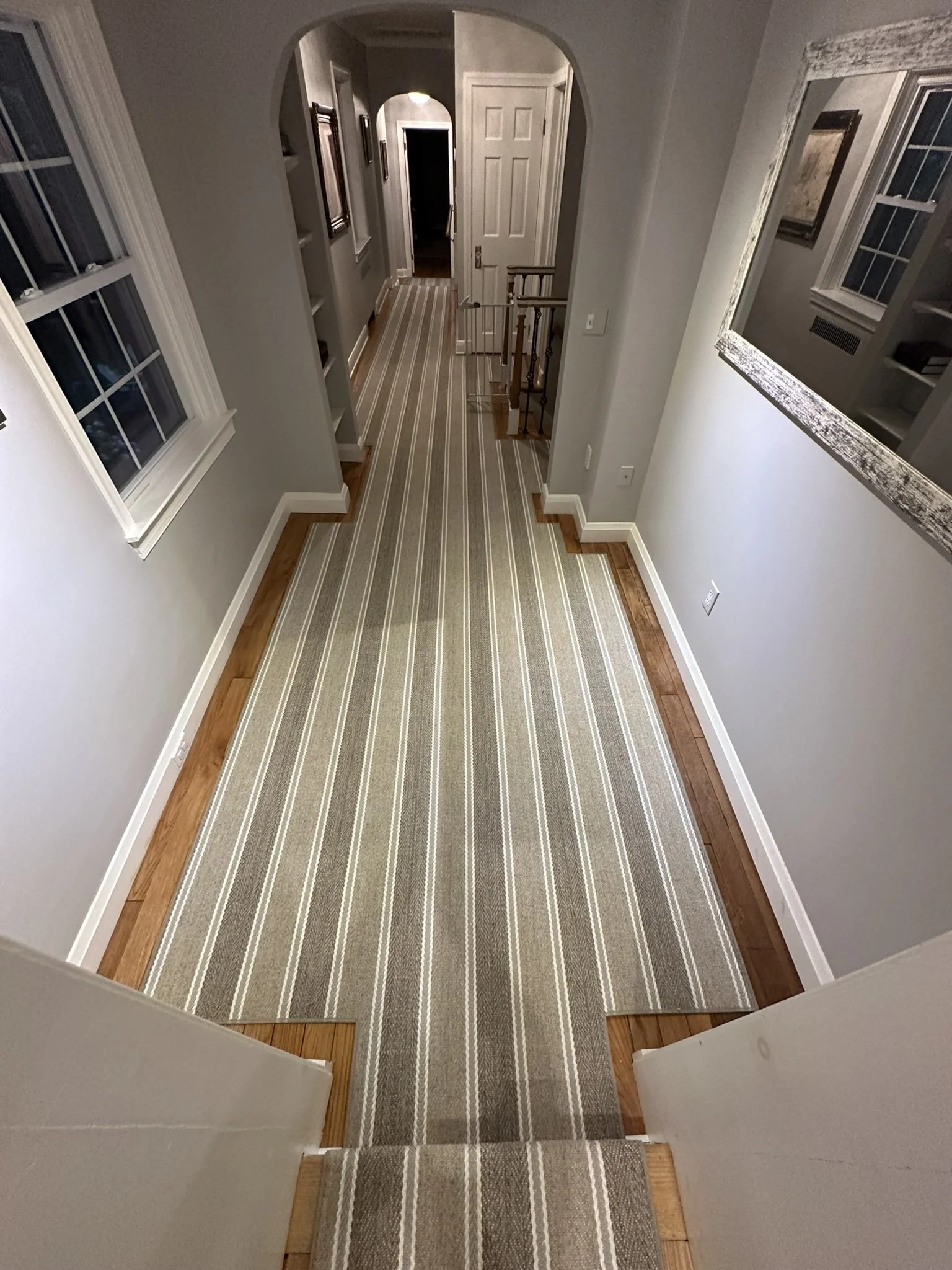 This flat woven rug was installed in this custom shaped hallway. It eventually leads to a staircase that is out of frame. It was templated with construction paper, fabricated, stretched in and pinned down.