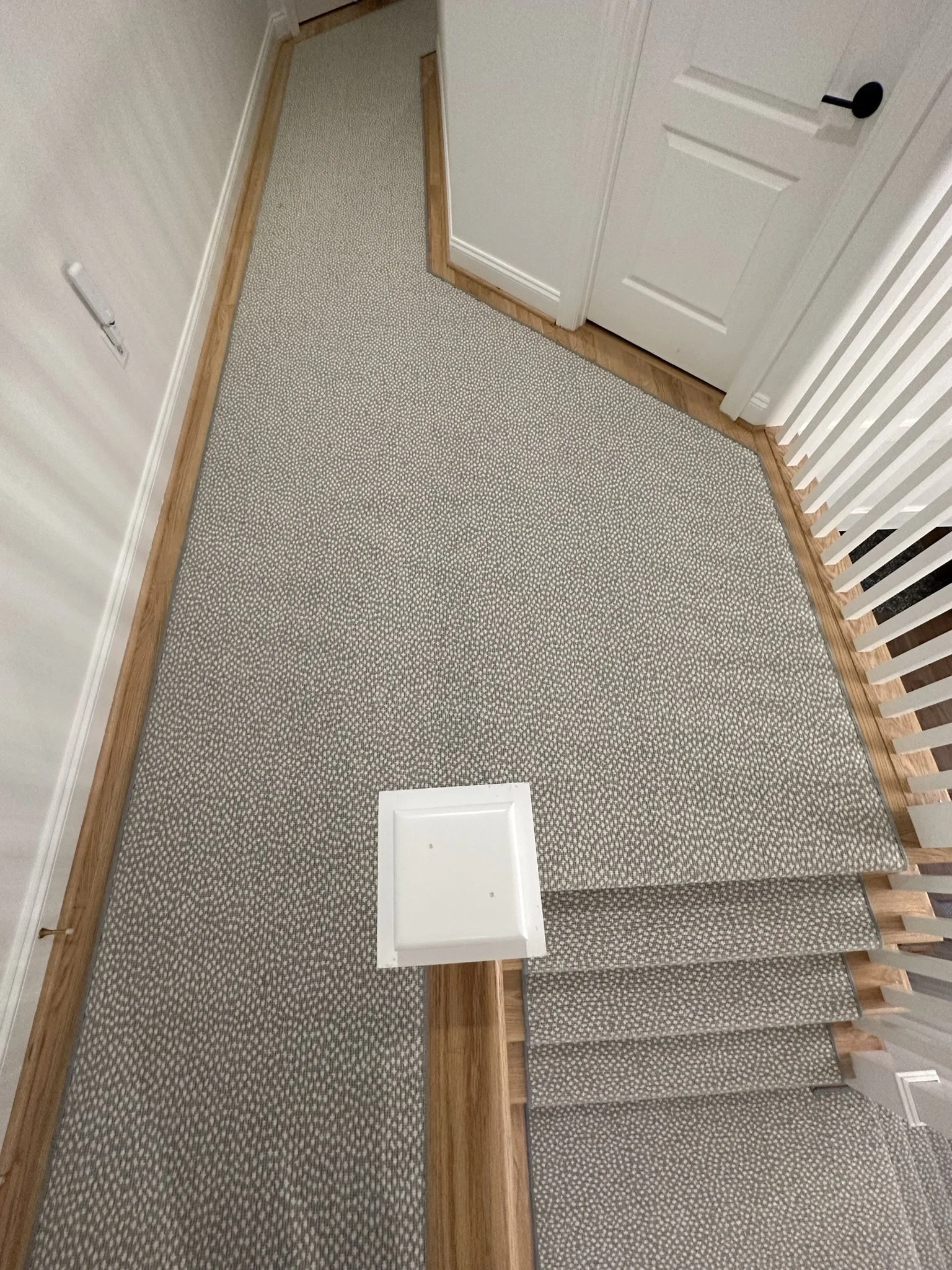 Beautiful wool woven carpet that was stretched in and pinned down in a custom shaped hallway, leading down to a rounded flight of steps.